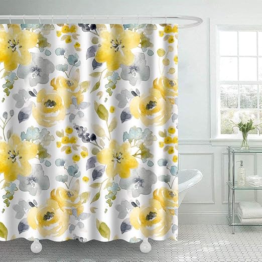 Amazon Com Colorpapa Yellow Flowers Shower Curtain Watercolor Bright Summer Pattern Yellow Gray Abstract Floral Bath Curtains For Bathroom Decor Waterproof Polyester Fabric 72x72 Inch Home Kitchen - Machine wash, gentle cycle, cold water, using mild detergent saffron infused marigold blooms on a pale yellow ground, with a delicate swirling leaf print